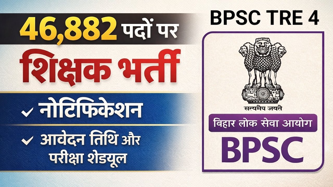 BPSC TRE 4 Notification 2026: क्या आप बिहार शिक्षक पद के लिए इंतजार कर रहे हैं? तो यह खबर आपके लिए बेहद जरूरी है। बिहार लोक सेवा आयोग (BPSC) के परीक्षा नियंत्रक ने 16 अप्रैल 2026 को TRE-4 भर्ती को लेकर बड़ा अपडेट दिया है। उन्होंने बताया कि TRE-4 का नोटिफिकेशन 19 या 20 अप्रैल को जारी किया जाएगा और फॉर्म भरने की प्रक्रिया 25 या 26 अप्रैल से शुरू होगी। इस बार कुल 46,882 पदों पर शिक्षकों का चयन किया जाएगा। परीक्षा 22 से 27 सितंबर 2026 के बीच आयोजित होगी। आवेदन online माध्यम से किया जाएगा।