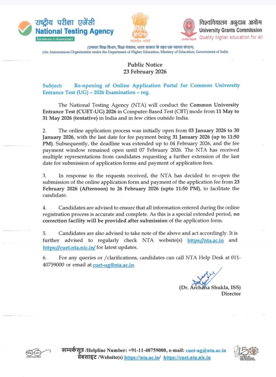 CUET UG 2026 Application Reopen: नेशनल टेस्टिंग एजेंसी ने कॉमन यूनिवर्सिटी एंट्रेंस टेस्ट CUET UG 2026 के लिए आवेदन प्रक्रिया को एक बार फिर खोल दिया है, जिससे उन अभ्यर्थियों को राहत मिली है जो किसी कारणवश पहले आवेदन नहीं कर पाए थे। यह परीक्षा देश के विभिन्न परीक्षा केंद्रों पर कंप्यूटर आधारित टेस्ट (CBT) मोड में आयोजित की जाएगी। CUET UG 2026 की परीक्षा 11 मई से 31 मई 2026 के बीच कराई जाएगी। NTA के अनुसार आवेदन पोर्टल 23 फरवरी 2026 से 26 फरवरी 2026 रात 11:50 बजे तक खुला रहेगा। उम्मीदवारों को सलाह दी गई है कि वे आवेदन करते समय सभी जानकारी सही और पूरी तरह भरें, क्योंकि इस बार सुधार का अवसर नहीं दिया जाएगा।