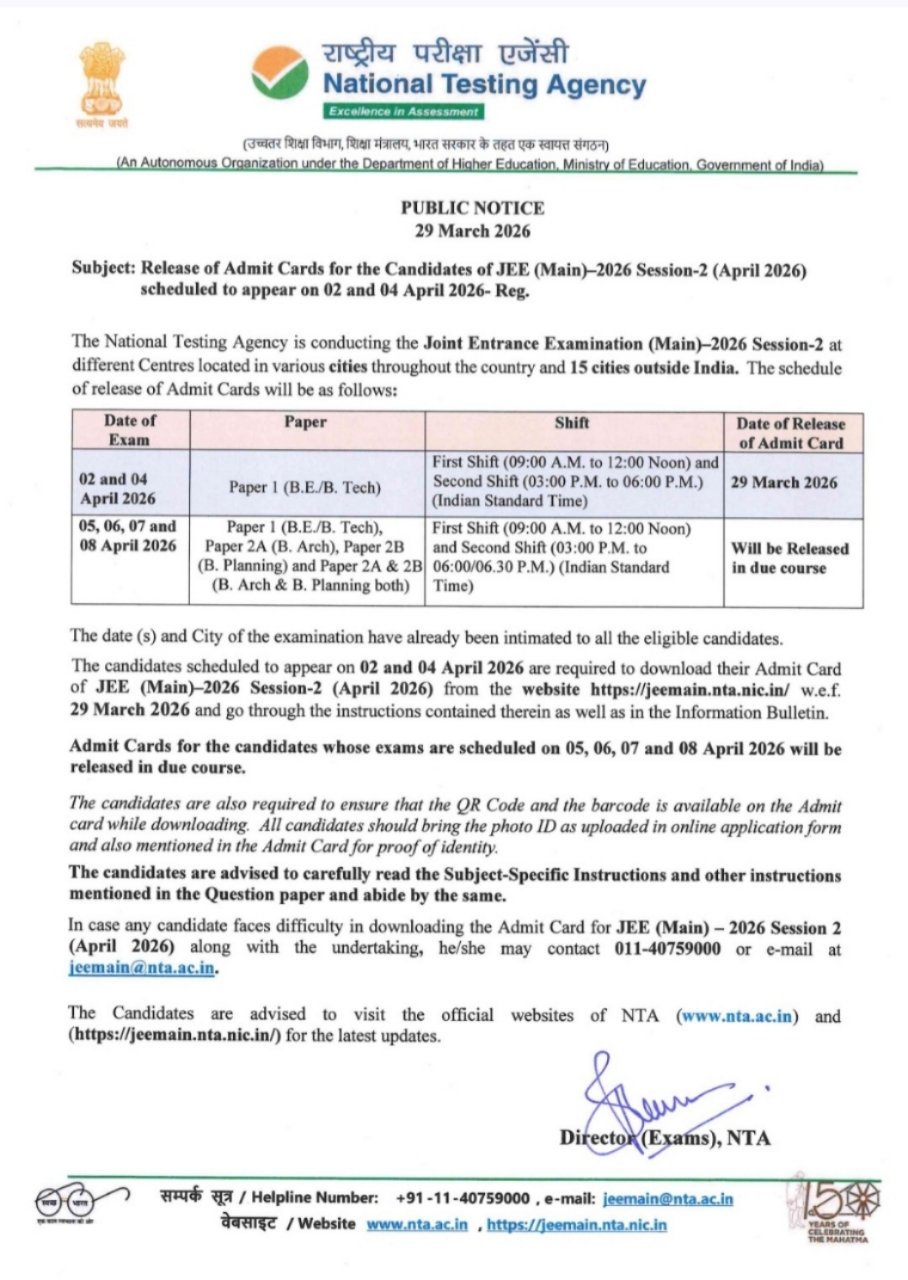 JEE Main Admit Card 2026:नेशनल टेस्टिंग एजेंसी (NTA) ने JEE Main 2026 Session 2 के लिए एडमिट कार्ड आधिकारिक रूप से जारी कर दिया है। जिन उम्मीदवारों ने अप्रैल सेशन के लिए आवेदन किया था, उनके लिए अब सबसे अहम समय शुरू हो गया है। लंबे इंतजार के बाद आखिरकार एडमिट कार्ड जारी कर दिए गए हैं और अब अभ्यर्थी परीक्षा की तैयारी के अंतिम चरण में पहुंच चुके हैं।पहले यह संभावना जताई जा रही थी कि एडमिट कार्ड मार्च के आखिरी सप्ताह यानी 28 से 30 मार्च के बीच जारी होंगे, और अब NTA ने इन्हें जारी भी कर दिया है। ऐसे में सभी उम्मीदवारों को सलाह दी जाती है कि वे तुरंत आधिकारिक वेबसाइट jeemain.nta.nic.in पर जाकर अपना एडमिट कार्ड डाउनलोड करें और उसमें दी गई सभी जानकारी को ध्यान से जांच लें, ताकि परीक्षा के दिन किसी प्रकार की परेशानी न हो।