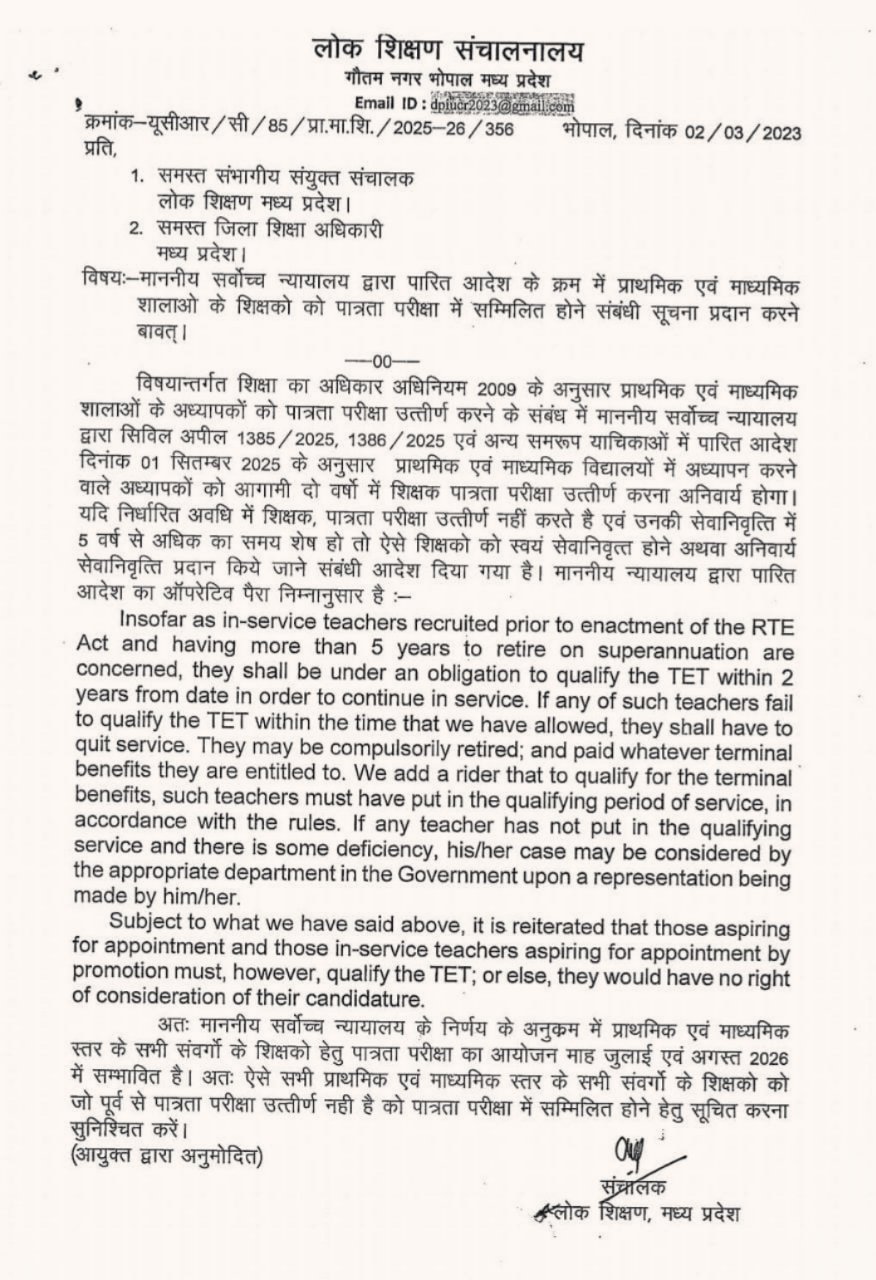 MP Teacher TET News: मध्यप्रदेश के प्राथमिक और माध्यमिक स्कूलों में पढ़ाने वाले उन शिक्षकों के लिए बड़ी खबर आई है जो अब तक TET यानी शिक्षक पात्रता परीक्षा पास नहीं कर पाए हैं। लोक शिक्षण संचालनालय भोपाल ने 02 मार्च 2025 को एक नोटिस जारी किया है जिसमें सुप्रीम कोर्ट के आदेश का हवाला देते हुए ऐसे सभी शिक्षकों को पात्रता परीक्षा में बैठने के लिए कहा गया है। यह नोटिस सभी संभागीय संयुक्त संचालकों और जिला शिक्षा अधिकारियों को भेजा गया है। परीक्षा जुलाई-अगस्त 2026 में होने की संभावना है।