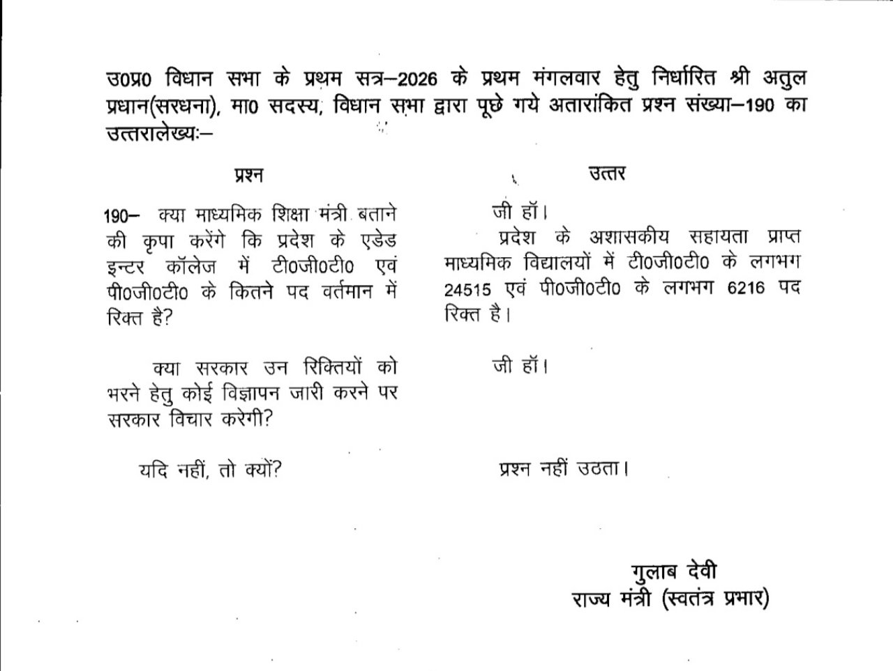 विधानसभा में पूछे गए सवाल में यह जानकारी मांगी गई थी कि प्रदेश के एडेड इंटर कॉलेजों में टीजीटी और पीजीटी के कितने पद खाली हैं। सरकार की ओर से दिए गए लिखित जवाब के अनुसार प्रदेश के अशासकीय सहायता प्राप्त माध्यमिक विद्यालयों में टीजीटी के लगभग 24515 पद और पीजीटी के लगभग 6216 पद इस समय रिक्त हैं। इतनी बड़ी संख्या में पद खाली होने से कई स्कूलों में पढ़ाई प्रभावित हो रही है और कई जगह एक ही शिक्षक को कई विषय पढ़ाने पड़ रहे हैं जिससे छात्रों को विषयवार पूरी पढ़ाई नहीं मिल पा रही है।