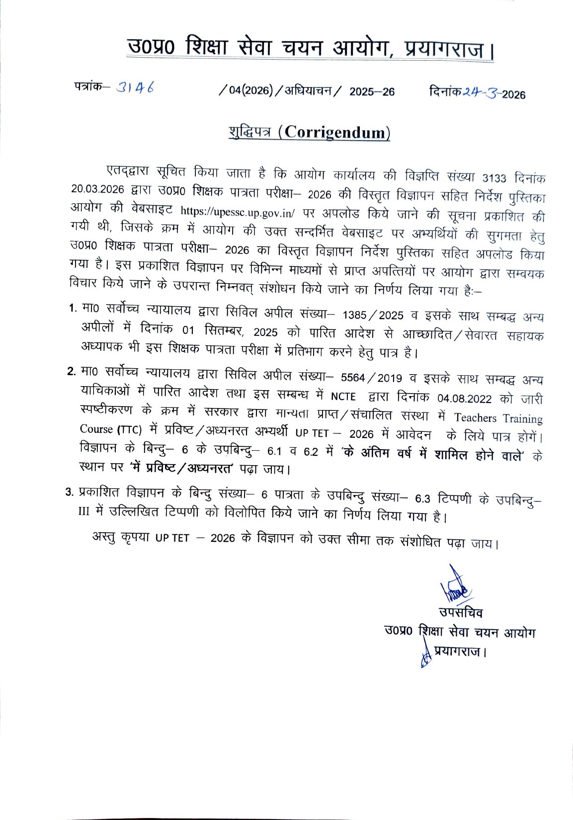 UPTET 2026 Corrigendum: उत्तर प्रदेश शिक्षा सेवा चयन आयोग, प्रयागराज ने UPTET 2026 के लिए एक जरूरी शुद्धिपत्र जारी किया है। 24 मार्च 2026 को आया यह अपडेट 20 मार्च को जारी पुराने विज्ञापन में कई बदलाव करता है। ये बदलाव अभ्यर्थियों की आपत्तियों और सुझावों के आधार पर किए गए हैं। सबसे बड़ी बात यह है कि अब पहले से ज्यादा उम्मीदवार इस परीक्षा के लिए योग्य माने जाएंगे। अगर आप UPTET 2026 की तैयारी कर रहे हैं तो यह खबर आपके लिए बेहद काम की है, क्योंकि पुरानी जानकारी के आधार पर आवेदन करना आपको मुश्किल में डाल सकता है। आयोग द्वारा किए गए कलेक्शन के बाद अब काफी अभ्यर्थियों को आवेदन करने का मौका मिल गया है।